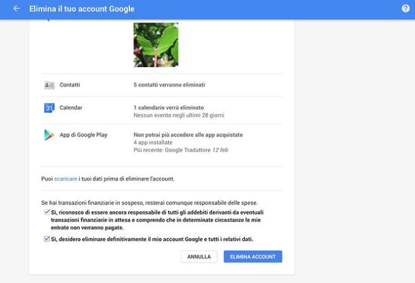 Cancellando completamente il tuo account, perderai infatti la possibilità di accedere a tutti i servizi online targati "big G", come YouTube e Google Drive. Inoltre, se hai uno smartphone Android perderai la possibilità di salvare rubrica e altri dati online e sincronizzarli con altri dispositivi.
