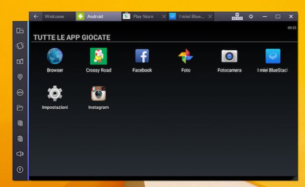 Impostazioni della piattaforma e di BlueStacks a parte puoi poi sfruttare i pulsanti presenti sulla barra collocata nella parte sinistra della finestra del programma per modificare le dimensioni delle app, per simulare lo scuotere il dispositivo, per catturare screenshot, per impostare la posizione geografica, per installare APK e per copiare i file da Windows. Sempre nella barra laterale sono poi presenti appositi pulsanti mediante cui effettuare operazioni di copia e incolla degli appunti, regolare il volume ed accedere alla guida di BlueStacks