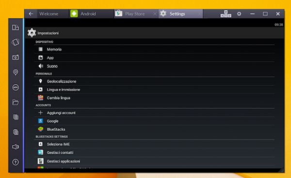 Se invece desideri configurare le impostazioni avanzate dell'emulatore, come ad esempio la lingua oppure la modalità di esecuzione delle varie app, clicca sull'icona a forma di ruota di ingranaggio che vedi in alto a destra e poi fai clic sulla voce Impostazioni annessa al menu che ti viene mostrato. Nella nuova schermata che a questo punto ti viene mostrata scegli una delle voci disponibili. Mediante le voci annesse alla sezione Dispositivo puoi gestire tutto quel che concerne memoria, app e suoni mentre mediante le voci annesse alla sezione Personale puoi regolare le impostazioni inerenti la localizzazione geografica, la lingua di scrittura e quella dell'interfaccia. La sezione Accounts ti permette invece di gestire tutto quel che riguarda gli account utilizzati con l'emulatore Android mentre la sezione BlueStacks settings ti consente di gestire contatti ed applicazioni, selezionare l'IME ed effettuare l'importazione dei file di Windows. Infine, le voci annesse alla sezione Sistema ti consentono di gestire data e ora e i parametri relativi all'accessibilità.