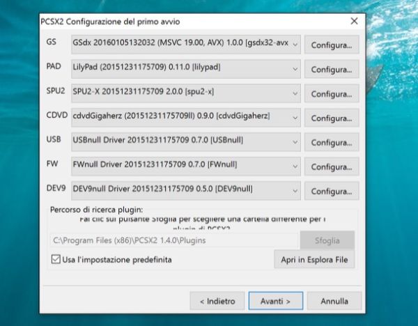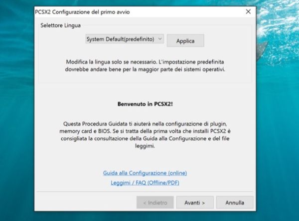 Ora puoi finalmente avviare PCSX2 ed eseguire la procedura di configurazione iniziale del programma. Non preoccuparti, sembra una cosa complicata ma in realtà è un vero gioco da ragazzi. Innanzitutto, accertati che ci sia selezionato l'italiano nel menu per la scelta della lingua (opzione System default) e clicca sul pulsante Avanti.
