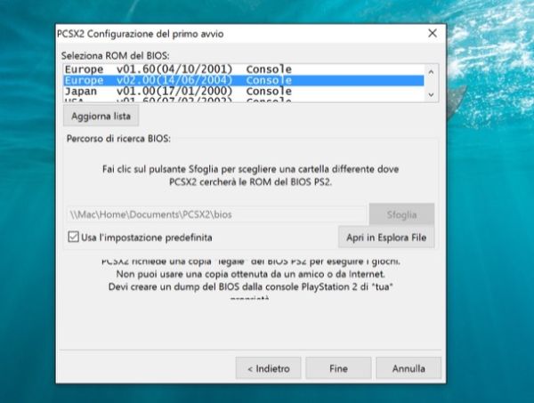 Ci siamo quasi! Clicca sul pulsante Avanti per proseguire nella procedura di configurazione iniziale di PCSX2, seleziona il firmware europeo più recente (Europe v2.00) e fai click su Fine per avviare la finestra principale dell'emulatore.