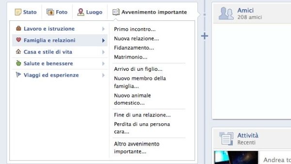 Un'altra delle più importanti novità apportate dal diario di Facebook è quella che permette di creare dei post speciali per eventi importanti, come lauree, matrimoni, cambiamenti lavorativi, traslochi, ecc.. Per aggiungere un evento importante alla tua timeline, non devi far altro che avviare normalmente la creazione di un nuovo messaggio e cliccare sul pulsante Avvenimento importante.