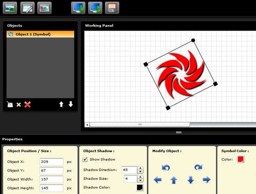 Puoi spostare e personalizzare ciascun elemento aggiunto al logo, selezionandolo con il mouse. Utilizza quindi i quadrati neri che compaiono intorno agli oggetti selezionati per ridimensionare questi ultimi, il cerchio nero per ruotarli su sé stessi e il riquadro Color per cambiare colore alle immagini pre-caricate nel servizio. Per aggiungere un'ombra all'oggetto selezionato, metti il segno di spunta accanto alla voce Show Shadow (in basso).
