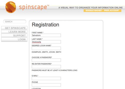 Collegati sul sito Internet di Spinscape e fai click prima sulla voce FREE ACCOUNT, presente in alto a destra, e poi sulla voce Click for a Free Account, presente nella pagina che si apre. Non ti resta che compilare il modulo di registrazione, inserendo il tuo nome e cognome rispettivamente nei campi di testo FIRST NAME e LAST NAME, il nome utente che desideri in DESIRED LOGIN NAME e la password in CHOOSE A PASSWORD e in RE-ENTER PASSWORD.