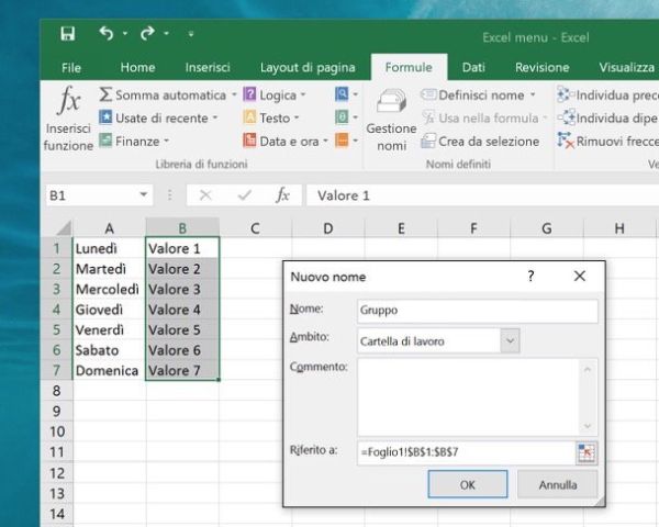 Vuoi fare un menu a tendina con Excel utilizzando i valori già presenti nel foglio di calcolo? Nessun problema. Seleziona con il mouse le celle che contengono i valori da inserire nel menu a tendina (i valori devono essere contenuti nella stessa colonna o nella stessa riga e non devono esserci interruzioni fra di essi), recati nella scheda Formule di Excel e clicca sul pulsante Definisci nome che si trova in alto a sinistra.