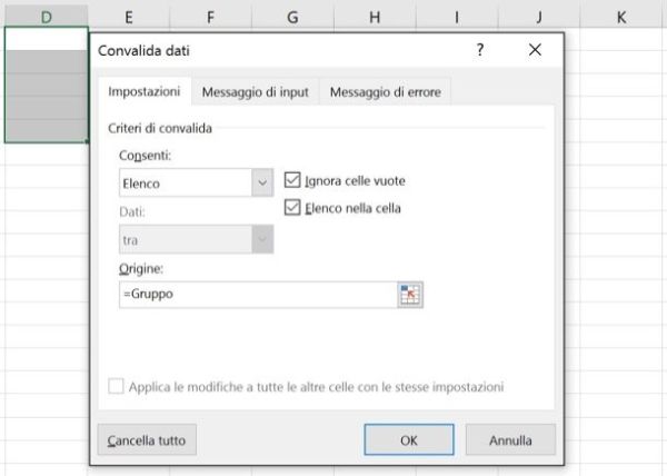 Nella finestra che si apre, seleziona la voce Elenco dal menu Consenti e digita il nome del gruppo di dati che hai creato in precedenza nel campo Origine, anticipandolo con il simbolo = (es. se hai chiamato il gruppo di valori "gruppo" devi digitare =gruppo). Clicca quindi sul pulsante OK per salvare i cambiamenti e il gioco è fatto.
