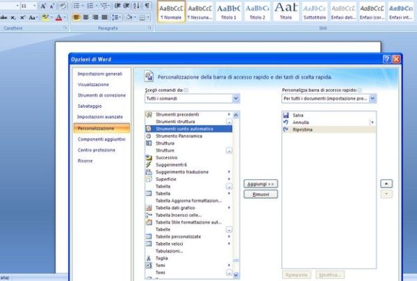 Se utilizzi Office 2007 e vuoi scoprire come fare un riassunto con Word, devi innanzitutto abilitare la visualizzazione dello strumento sunto automatico nella barra degli strumenti del programma. Avvia quindi Word tramite la sua icona presente nel menu Start > Tutti i programmi > Microsoft Office di Windows e, nella finestra che si apre, clicca prima sul pulsante con il logo di Office in alto a sinistra e poi su Opzioni di Word. Recati dunque nella sezione Personalizzazione attraverso la barra laterale di sinistra, imposta la voce Tutti i comandi dal menu a tendina Scegli comandi da e fai doppio click sulla voce strumenti sunto automatico per aggiungere lo strumento sunto automatico alla barra di accesso rapido di Word. Per salvare le impostazioni, clicca su OK.