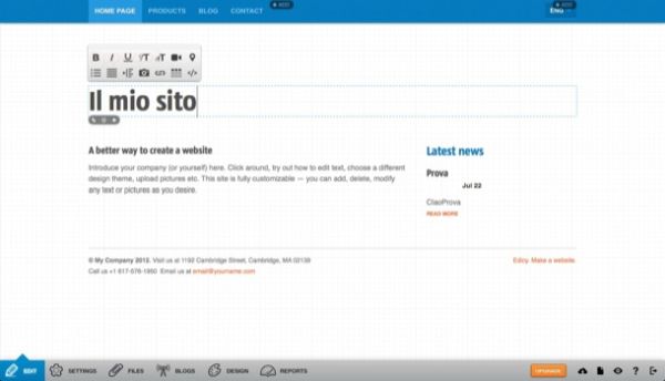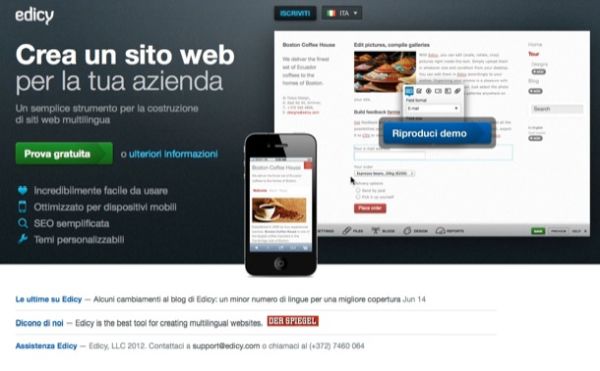 Fra i servizi online che consentono di realizzare siti Web "al volo", uno dei più semplici da usare è Edicy che prevede un piano base gratuito attraverso il quale è possibile creare siti con 100 MB di storage, fino a cinque pagine e un dominio di terzo livello (nome.edicy.com) più due piani a pagamento: quello standard che a 6 euro/mese che propone 2GB di storage, 30 pagine e un dominio personalizzato e quello denominato Plus che invece per 10 euro/mese offre 10GB di spazio, pagine illimitate e un dominio personalizzato.
