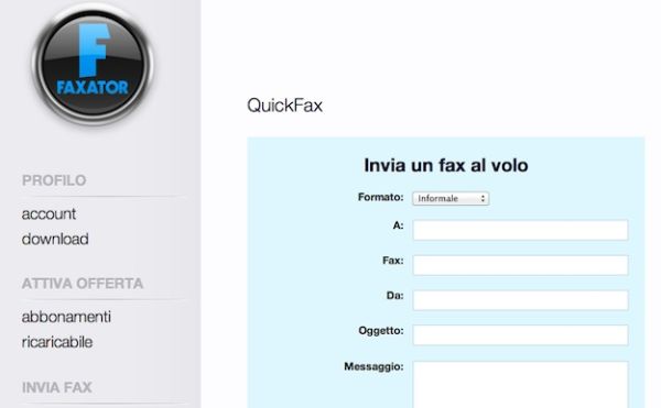 Una volta completata l'iscrizione al servizio, puoi inviare fax online con Faxator semplicemente cliccando sulla voce area riservata collocata nella barra laterale di sinistra ed eseguendo l'accesso al sito. Clicca quindi sulla voce quickFax (sempre nel menu che si trova sulla sinistra) per comporre un nuovo fax digitandone il testo “manualmente” oppure sulla voce quickFax allegato per faxare un documento già esistente (il file non deve avere una grandezza massima superiore ad 1MB. I fax vengono inviati dal lunedì al venerdì tra le 8.00 e le 20.00 e al sabato dalle 8.00 alle 13.00 (esclusi i festivi).