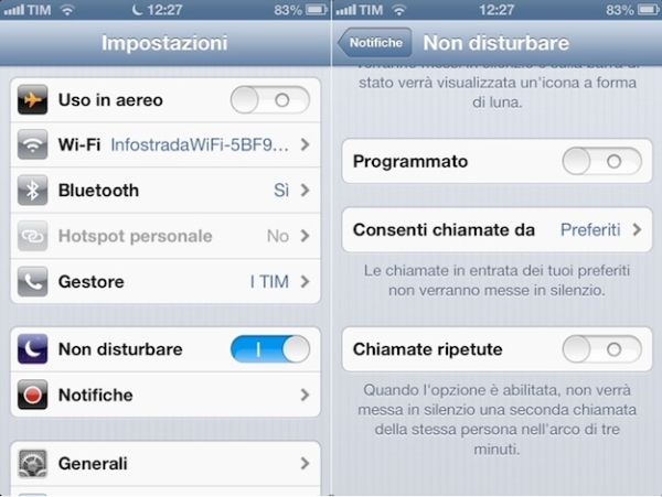Recati quindi nelle Impostazioni di iOS, sposta lo switch dell'opzione Non disturbare su ON (in modo che la levetta diventi azzurra) e pigia sul pulsante Notifiche. Nella schermata che si apre, seleziona la voce Non disturbare ed imposta la preferenza Consenti chiamate da su Preferiti (mettendo il segno di spunta accanto all'apposita voce). Adesso, torna nel menu precedente e sposta su OFF lo switch Chiamate ripetute in maniera tale che l'iPhone non lasci passare le chiamate di quelle persone che, seppur non incluse nei preferiti, hanno chiamato per più di una volta in tre minuti e quindi secondo il “melafonino” sono degne di attenzione.