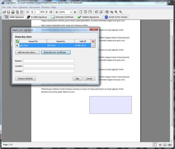 Nella finestra che si apre, importa in DigiSigner il documento PDF che intendi firmare cliccando sull'icona della cartella in alto a sinistra, fai click sul pulsante Visible Signature (sempre in alto a sinistra, ma sotto l'icona della cartella) e disegna con il mouse un rettangolo nel punto del foglio in cui intendi apporre la tua firma digitale. A questo punto, hai due strade da percorrere: importare il file pfx della tua firma che usi anche in ufficio cliccando sul pulsante Add new key stroke (e poi su Add nella finestra che si apre) oppure generare una firma tutta nuova cliccando sul pulsante Generate new certificate.