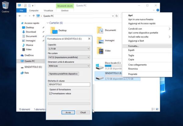 Qual è la differenza tra formattazione veloce e formattazione completa? Dunque, durante la formattazione veloce - che dura pochi secondi - Windows si occupa semplicemente di preparare il drive per il nuovo utilizzo. Non controlla se ci sono settori danneggiati sul disco e non provvede a riscrivere l'unità per evitare il recupero di dati da quest'ultima. Con la formattazione completa, invece, l'unità viene preparata per il nuovo utilizzo, viene effettuato un controllo relativo all'integrità di tutti settori e vengono scritti degli “zeri” sul drive per rendere più difficile il recupero dei dati cancellati[1]. Il tutto, naturalmente, al costo di spendere qualche minuto in più per il completamento dell'intera procedura.
