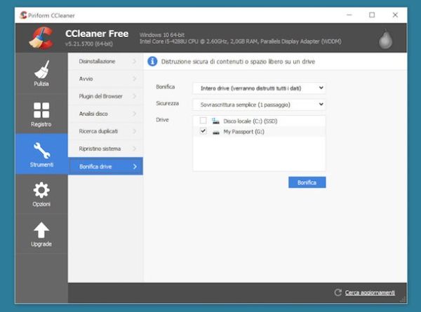 Se hai bisogno del massimo livello di privacy, ti consiglio di bonificare lo spazio libero presente sui tuoi drive (hard disk, chiavetta USB e schede SD) con soluzioni di terze parti, come ad esempio CCleaner, che è in grado di riscrivere il disco più volte in modo da rendere praticamente impossibile il recupero dei dati cancellati.