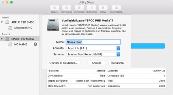 Nella finestra che si apre, imposta il menu a tendina Formato sull'opzione MS-DOS (FAT), imposta l'opzione Master Boot Record (MBR) nel menu Schema (in modo da rendere l'unità compatibile anche con i PC Windows), digita il nome da assegnare al volume nell'apposito campo di testo e pigia sul bottone Inizializza due volte consecutive per avviare la formattazione.
