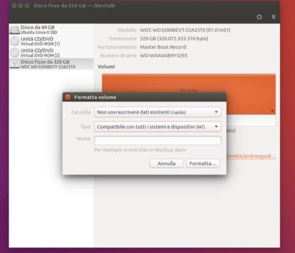 Se utilizzi Ubuntu, puoi formattare un drive in FAT32 aprendo l'utility Dischi (che puoi trovare effettuando una semplice ricerca nella Dash del sistema operativo), selezionando l'unità da formattare dalla barra laterale di sinistra e cliccando prima sulla partizione su cui operare (se il disco non è stato suddiviso in più partizioni, dovrebbe essercene solo una), poi sul pulsante con l'icona dei due ingranaggi e infine sulla voce Formatta partizione.
