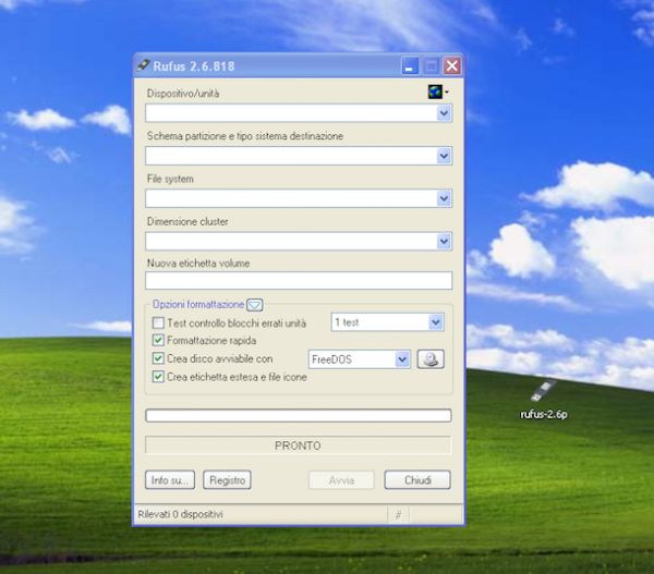 Dopo aver ottenuto il file ISO di Windows XP procedi andando a copiare quest'ultimo su una chiavetta USB. Per effettuare questa operazione puoi utilizzare il programma gratuito Rufus. Per scaricare il software sul tuo PC clicca qui dopodiché clicca sul collegamento Rufus 2.x portable collocato al centro della pagina Web che è andata ad aprirsi, sotto la dicitura Download. In seguito, avvia il file rufus-2.2p.exe appena scaricato e clicca prima su Esegui e poi su Sì per accedere alla schermata iniziale del programma. Qualora il file scaricato non dovesse avviarsi puoi rimediare effettuando il download di una versione precedente del programma che puoi ottenere facendo clic sulla voce Altre versioni sempre annessa sotto la dicitura Download nella pagina Web del software.