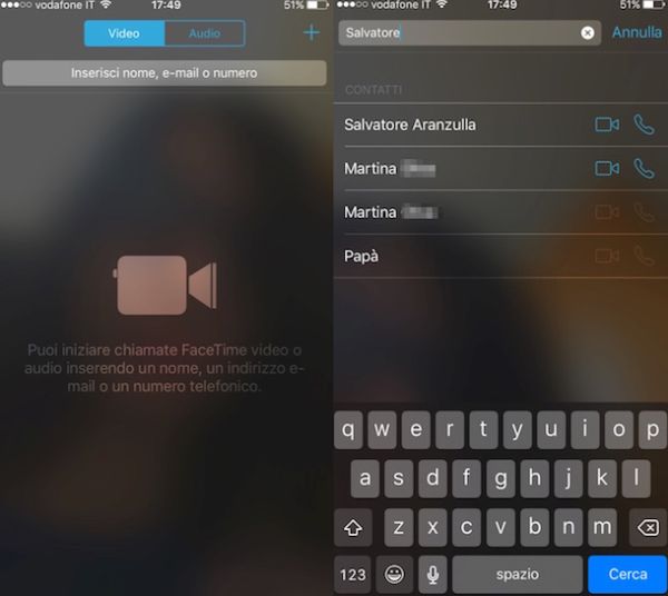 A questo punto se desideri effettuare una chiamata solo audio pigia sull'icona raffigurante la classica cornetta del telefono. Se invece è tua intenzione effettuare una chiamata sia audio che video pigia sull'icona di FaceTime.