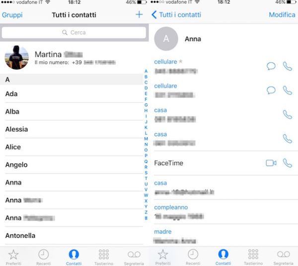 In alternativa sappi che puoi utilizzare FaceTime anche agendo dall'app Telefono, quella che di solito utilizzi per effettuare le normali telefonate. Per utilizzare FaceTime tramite l'app Telefono pigia sull'icona di quest'ultima annessa alla home screen del tuo dispositivo. Successivamente pigia sulla scheda Contatti che risulta collocata in basso, individua il nome del contatto che desideri chiamare scegliendolo dall'elenco visualizzato a schermo oppure digitandolo direttamente nell'apposita barra di ricerca collocata in alto e poi individua la voce FaceTime nella schermata che successivamente ti verrà mostrata.