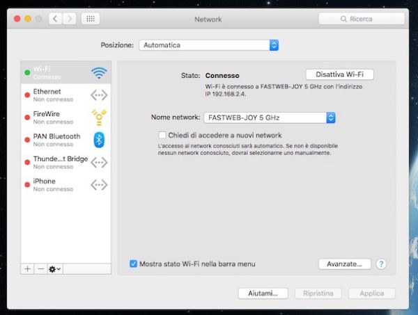 Se desideri scoprire come funziona FaceTime ed hai a tua disposizione un Mac la prima cosa che devi fare è accertarti del fatto che il tuo computer sia connesso ad una rete Wi-Fi attiva e funzionante oppure che su questo ultimo risulti abilitata una connessione via cavo. Per verificare ciò ti basta avviare l'applicazione Preferenze di sistema, fare clic su Network ed accertarti del fatto che accanto alla voce Wi-Fi o accanto alla voce Ethernet risulti presente un pallino di colore verde. In caso contrario provvedi a collegarti al network a cui solitamente accedi.