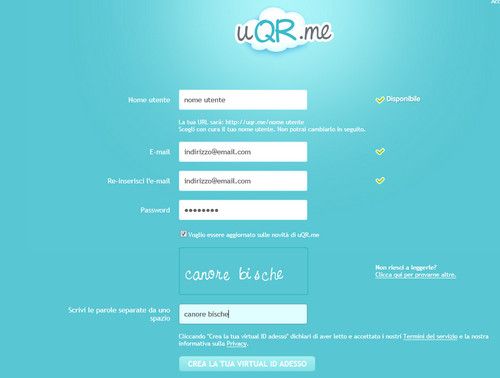 Innanzitutto, collegati al sito Internet uQR.me e clicca sul pulsante arancione CREA LA TUA VIRTUAL ID ADESSO per creare un account gratuito. Nella pagina che si apre, compila il modulo che ti viene proposto con i tuoi dati personali (nome utente, e-mail e password), digita il codice di conferma nel campo Scrivi le parole separate da uno spazio e clicca sul pulsante CREA LA TUA VIRTUAL ID ADESSO per inviare la tua richiesta d'iscrizione.