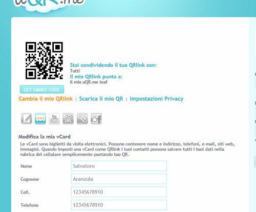 Ad operazione completata, clicca prima sul collegamento Scarica il mio QR (in alto) e poi sul pulsante JPG (per Web/cellulari) o sul pulsante PDF (per un codice universale da usare in qualsiasi circostanza) per scaricare il tuo QR Code sul PC. Se desideri condividere il tuo QR Code su siti Internet e blog, clicca sul pulsante arancione GET EMBED CODE e utilizza il codice che compare.