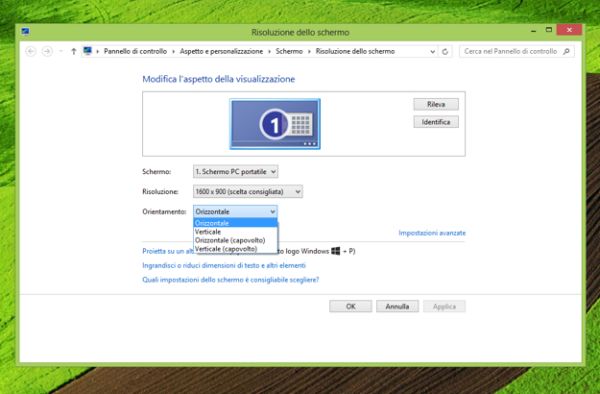 Per girare lo schermo su Windows 8 su un tablet o un dispositivo ibrido ti basta invece ruotare il dispositivo in orizzontale e in verticale. L'orientamento del desktop verrà adattato automaticamente alla posizione del device così come accade con iPad o con i tablet Android.
