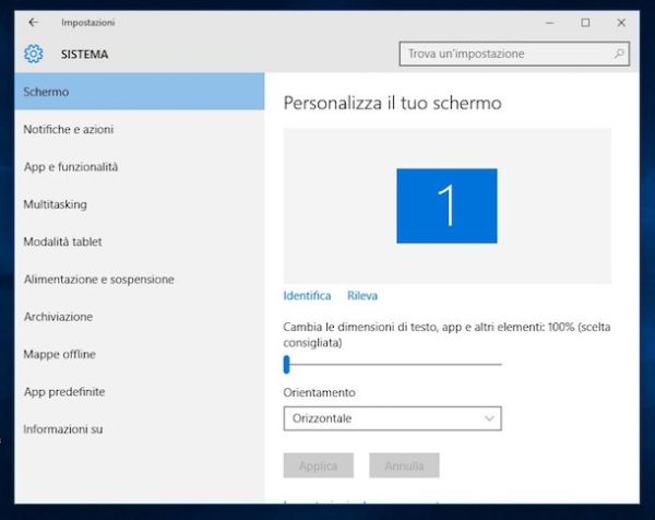 Nella finestra che si apre espandi il menu a tendina Orientamento, scegli il grado di rotazione che vuoi applicare allo schermo e poi clicca sul pulsante Applica per salvare i cambiamenti. Puoi scegliere se ruotare lo schermo in Verticale, in Orizzontale (capovolto) oppure in Verticale (capovolto).