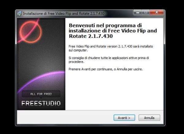 Il primo passo che devi compiere è collegarti al sito Internet di Free Video Flip and Rotate e cliccare sulla voce Scarica subito (collocato sulla destra) per scaricare il programma sul tuo PC. A scaricamento ultimato apri, facendo doppio click su di esso, il file appena scaricato (FreeVideoFlipAndRotate.exe) e, nella finestra che si apre, clicca prima su Esegui e poi su Sì, OK e Avanti.