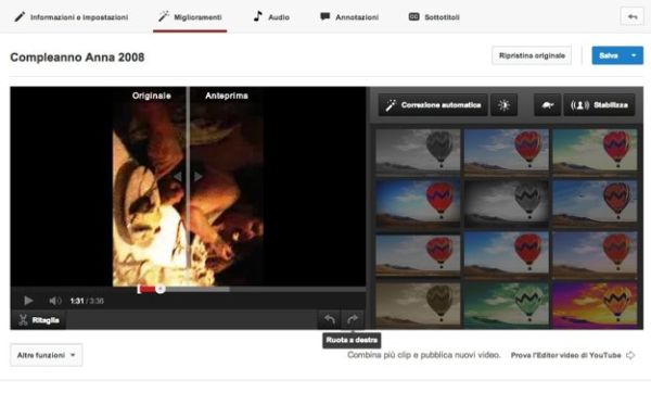 Nella pagina che si apre, individua il filmato da correggere, clicca sulla freccia collocata accanto al pulsante Modifica e seleziona la voce Miglioramenti dal menu che compare. A questo punto, non devi far altro che cliccare su uno dei due pulsanti - Ruota a destra o Ruota a sinistra - collocati sotto il player di YouTube e salvare i cambiamenti facendo click sul pulsante Salva che si trova in alto a destra. Più facile di così?