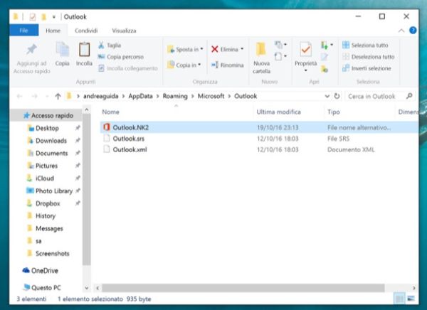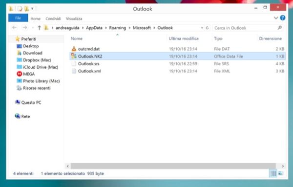 Nella finestra che si apre, individua il file Outlook.NK2 e copialo su una chiavetta USB o in una cartella di tua scelta, in modo da averlo a portata di mano per il trasferimento su un altro PC e/o un'altra installazione di Outlook.