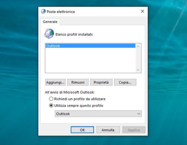 Dopodiché vai su Posta elettronica, pigia sul pulsante Mostra profili che si trova nella finestra che si apre e controlla il nome del tuo profilo Outlook. Se il nome del profilo dovesse risultare diverso da "Outlook", rinomina il file NK2 di conseguenza (se, per esempio, il tuo profilo si chiama "Utente", devi rinominare il file in "Utente.NK2").