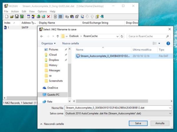 Successivamente, recati nel menu File > Save as, seleziona la voce Outlook 2010 AutoComplete .dat file (Stream_Autocomplete*.dat) dal menu a tendina Salva come e salva il file nella cartella C:\Users\tuonome\AppData\Local\Microsoft\Outlook\RoamCache sovrascrivendo il file Stream_Autocomplete_0_[xx].dat presente attualmente nella cartella.