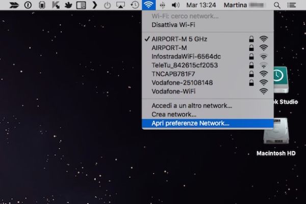 Se invece possiedi un Mac e ti piacerebbe capire come fare per impostare DNS la prima operazione che devi effettuare è quella di fare sull'icona di rete collocata accanto all'orologio di sistema. Successivamente pigia sulla voce Apri preferenze Network… annessa al menu che ti viene mostrato.