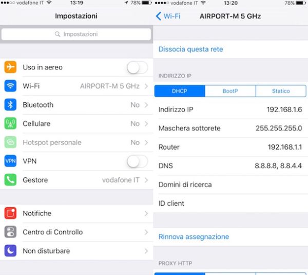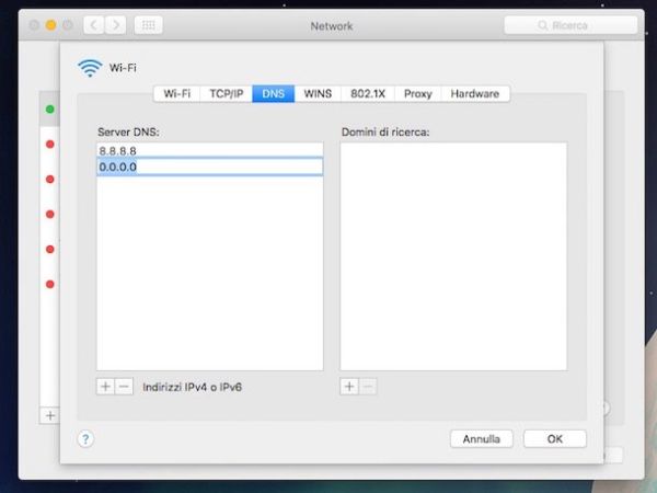 Successivamente cancella tutto quanto presente nel campo DNS e poi digita gli indirizzi dei server DNS che intendi impostare avendo cura di separarli tra loro con una virgola. Se lo desideri puoi approfondire il discorso relativo ai terminali Apple consultando i miei tutorial su come velocizzare Internet su iPhone e come cambiare DNS su iPad.