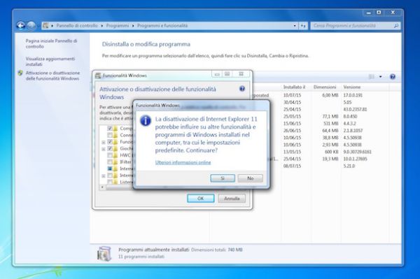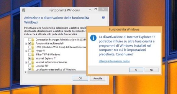 Una volta fatto ciò togli il segno di spunta dalla voce Internet Explorer x dove al posto di x trovi indicata la versione di IE in suo sul tuo computer dopodiché clicca prima su Si e poi su OK per procedere con la disinstallazione di Internet Explorer.