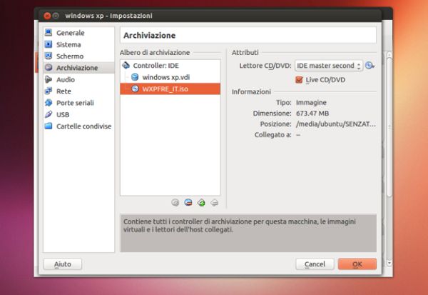 Successivamente, clicca sull'icona del CD che si trova in alto a destra e seleziona la voce Lettore host dal menu che si apre se vuoi utilizzare un disco d'installazione di Windows per installare il sistema operativo nella macchina virtuale, oppure seleziona la voce Scegli un file di disco CD/DVD virtuale e scegli quale immagine ISO di Windows usare. Infine, clicca su OK per salvare i cambiamenti.