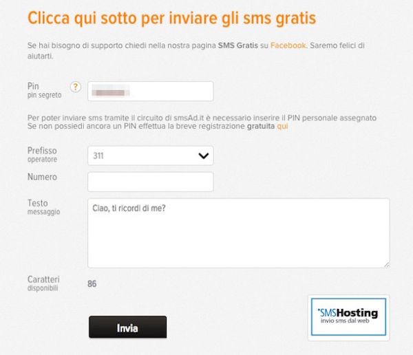 Successivamente digita il PIN nella sezione PIN dedicata al modulo per l'invio degli SMS pigia sul pulsante Invia ed attendi qualche istante affinché la procedura mediante cui inviare SMS venga avviata e portata a termine.