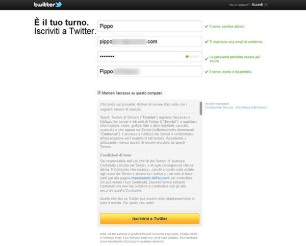 A questo punto, si aprirà una pagina con il riepilogo dei dati che hai inserito ed eventuali indicazioni su quelli che vanno cambiati (es. username già in uso, password non sicure, ecc.). Se tutti gli indicatori sono verdi e i dati inseriti sono stati accettati da Twitter, assicurati che ci sia il segno di spunta accanto alla voce Mantieni l'accesso su questo computer (in questo modo eviterai di dover digitare ogni volta i dati di accesso al servizio) e clicca sul pulsante giallo Iscrivimi a Twitter per completare l'iscrizione a Twitter.