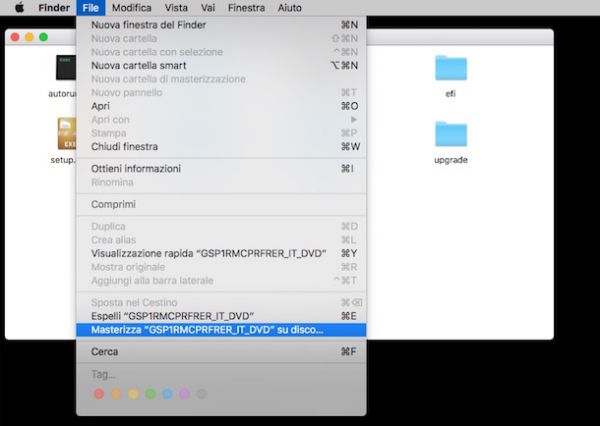 A questo punto fai clic sulla voce File annessa alla barra dei menu relativa alla nuova finestra con il contenuto del file ISO che è andata ad aprirsi (quella che ti mostra il contenuto del file ISO), dopodiché pigia sulla voce Masterizza “Nome Immagine ISO” su disco… dove al posto di Nome Immagine ISO trovi il nome del file ISO che è tua intenzione masterizzare.