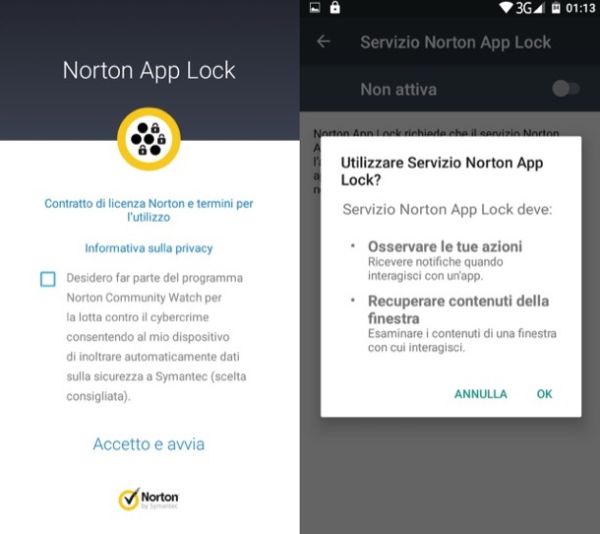 Norton App Lock è una delle applicazioni più apprezzate nel suo genere. Sviluppata dalla stessa software house del celeberrimo Norton antivirus (quindi un'azienda dall'altissimo grado di affidabilità), permette di creare una lista di app “top-secret” e di proteggerle con un PIN numerico o una sequenza da "disegnare" sullo schermo. È talmente intuitiva che spiegare come funziona è quasi superfluo. Dopo averla scaricata sul tuo smartphone non devi far altro che avviarla e scegliere se partecipare al programma Norton Community Watch inviando delle statistiche d'uso a Symantec.