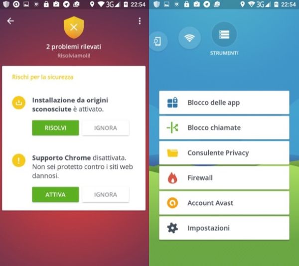 Una volta conclusa la scansione antimalware, analizza attentamente i risultati ottenuti (potrebbero esserti segnalati come minacce anche dei rischi potenziali, come ad esempio la possibilità di installare app provenienti da fonti esterne al Play Store) e passa alla schermata principale dell'applicazione. Pigia quindi sul pulsante Strumenti che si trova in alto a destra e seleziona la voce Blocco delle app dal menu che compare.