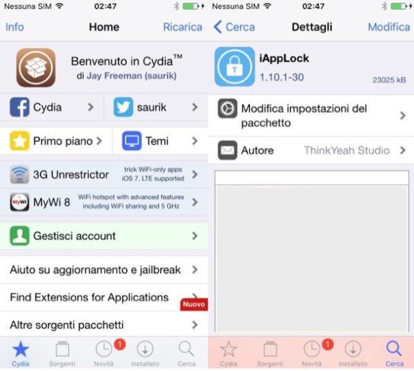 Se tu hai un iPhone sbloccato tramite jailbreak, puoi installare iAppLock aprendo Cydia e cercando il tweak nella scheda Cerca dello store (in basso a destra). A ricerca effettuata, procedi all'installazione di iAppLock pigiando prima sul suo nome e poi sul pulsante Installa che si trova in alto a destra nella schermata che si apre.