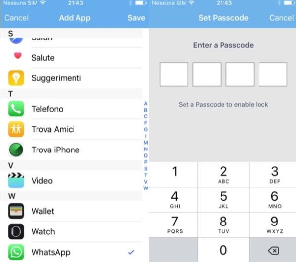 Ad installazione completata, avvia iAppLock, seleziona WhatsApp dalla lista delle app installate sul telefono e pigia sul pulsante Save collocato in alto a destra. Dopodiché digita il PIN che vuoi usare per proteggere l'accesso all'applicazione (per due volte consecutive) e il gioco è fatto.