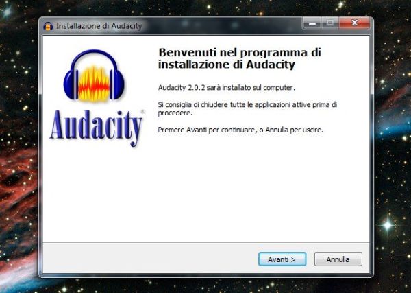 Se vuoi scoprire come mixare la voce con Audacity, il primo passo che devi compiere è collegarti al sito Internet del programma e cliccare sulla voce Scaricate Audacity 2.0.2 per scaricarlo sul tuo PC. A download completato apri, facendo doppio click su di esso, il file appena scaricato (es. audacity-win-2.0.2.exe) e, nella finestra che si apre, clicca prima su Esegui e poi su Sì, OK ed Avanti per quattro volte consecutive. Prosegui dunque facendo click su Installa, Avanti e Fine e al termine del processo d'installazione Audacity si avvierà automaticamente.
