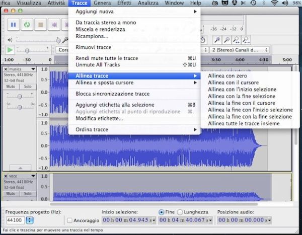 Se desideri posticipare o anticipare manualmente la traccia vocale di qualche istante, seleziona lo strumento spostamento temporale presente nella barra degli strumenti del programma (l'icona ↔) e sposta il grafico con il mouse. Se invece preferisci adoperare le funzioni automatiche incluse nel software, recati nel menu Tracce > Allinea tracce e seleziona una delle opzioni disponibili (es. Allinea con il cursore, Allinea tutte le tracce insieme, ecc.).