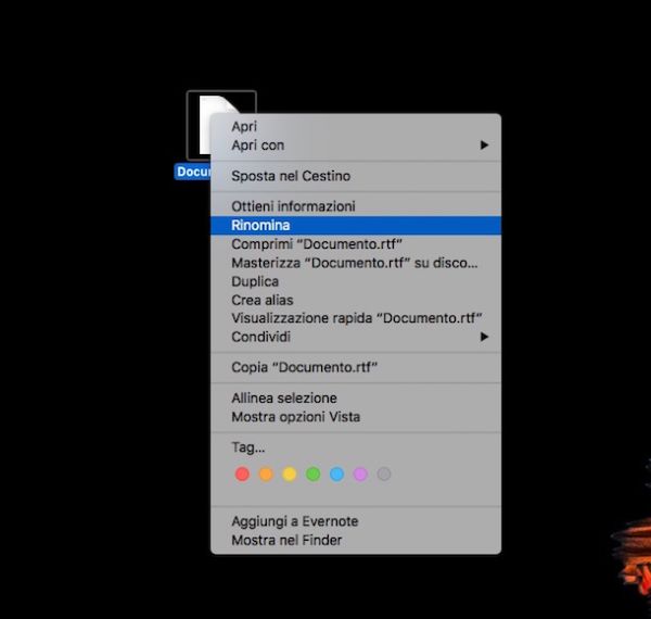A questo punto direi che ci siamo, puoi finalmente procedere andando a modificare estensione file su OS X. Per fare ciò seleziona con il tasto destro del mouse l'elemento su cui è tua intenzione operare e clicca poi sulla voce Rinomina annessa al menu che si apre. In alternativa ti basta pigiare con il tasto sinistro del mouse sul nome del file ed attendere che quest'ultimo venga evidenziato oppure puoi cliccare sul nome del file con il tasto sinistro del mouse e pigiare il pulsante Invio sulla tastiera.