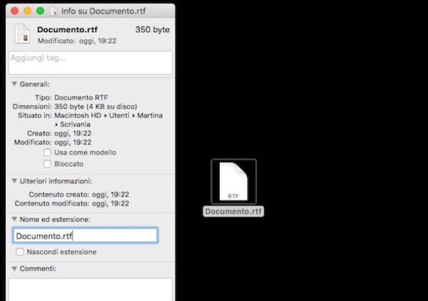 In alternativa al procedimento che ti ho appena indicato puoi modificare estensione file andando a correggere quest'ultima cliccando con il tasto destro del mouse sull'elemento su cui è tua intenzione agire, pigiando sulla voce Ottieni informazioni annessa al menu che ti viene mostrato e modificando, così come ti ho appena indicato, il campo di testo collocato sotto la voce Nome ed estensione: della finestra che ti viene mostrata. Successivamente chiudi semplicemente la finestra per confermare le modifiche apportate.