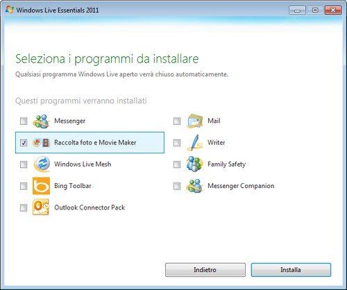 Metti quindi il segno di spunta solo accanto alla voce Raccolta Foto e Movie Maker, per installare solo Windows Live Movie Maker (più Raccolta foto di Windows Live) senza gli altri programmi inclusi in Windows Live Essentials, e clicca prima su Installa e poi su Chiudi per completare la procedura.