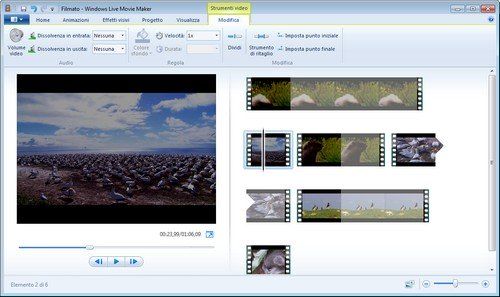 Ad installazione completata, avvia Windows Live Movie Maker tramite la sua icona presente nel menu Start > Tutti i programmi di Windows e, nella finestra che si apre, clicca sul pulsante Aggiungi video e foto per selezionare i video che vuoi usare come base del tuo filmato da montare. I video caricati in Windows Live Movie Maker saranno visualizzati sotto forma di anteprime nella finestra principale del programma. Per suddividere i filmati in scene da spostare e riordinare come più preferisci, recati nella scheda Modifica di Movie Maker e metti in pausa il player del programma nel punto iniziale della prima scena che vuoi tagliare.