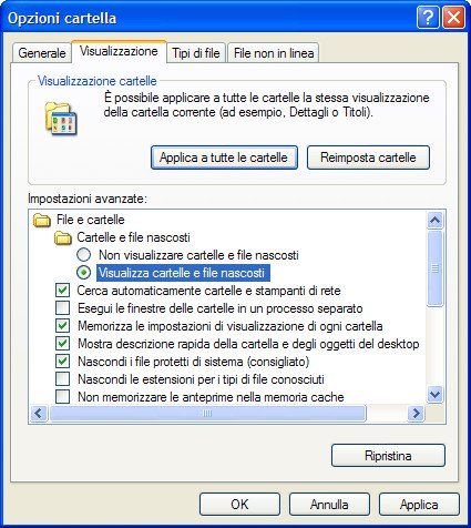 Se utilizzi Windows XP, apri una cartella qualsiasi (in modo da avviare l'Esplora Risorse) e seleziona la voce Opzioni cartella dal menu Strumenti. Nella finestra che si apre, clicca sulla scheda Visualizzazione, metti il segno di spunta accanto alla voce Visualizza cartelle e file nascosti e clicca prima su Applica e poi su OK per salvare i cambiamenti.